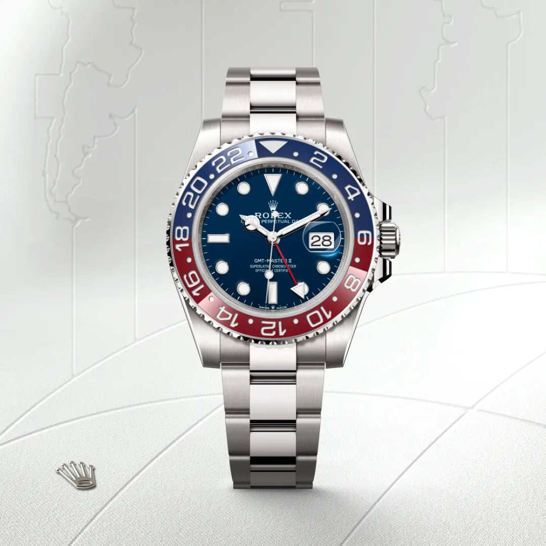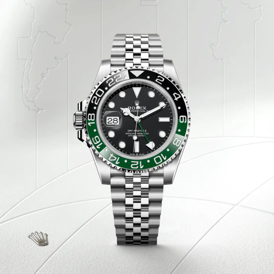 GMTマスター Ⅱは、距離やタイムゾーンを超えて人々を繋ぐ究極のコスモポリタンウォッチだ。専用の24時間針と、24時間目盛り入りの2色の回転ベゼルにより、従来の時刻に加え、第2タイムゾーンの時刻も表示する。着用者は現在の場所と世界の別の場所の時刻を瞬時に確認することができ、特別な場所、思い出の地、将来の旅先といった、それぞれの「世界のどこか」との繋がりを強めてくれる。