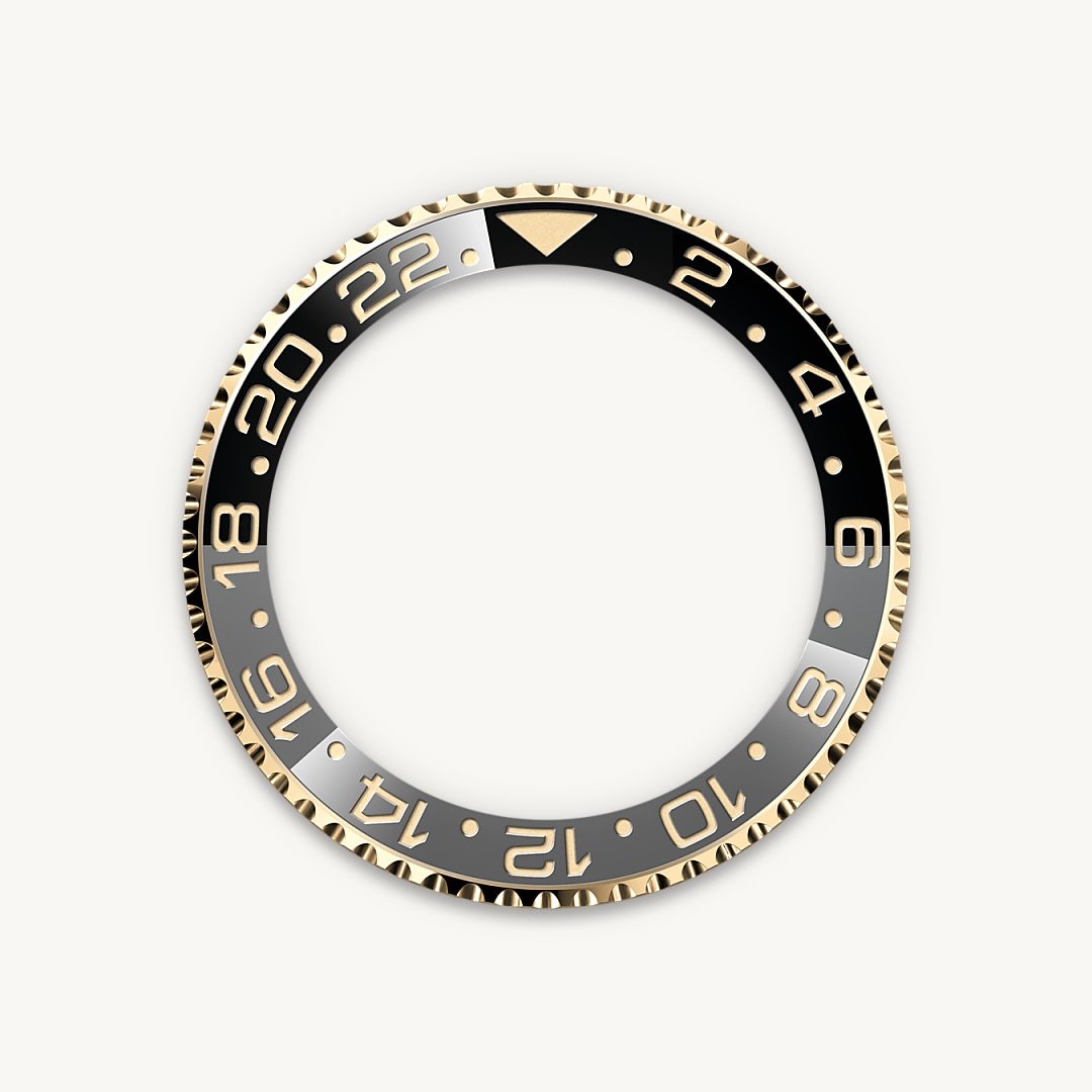 ベゼル : 両方向回転式、24時間目盛り入り。グレー/ブラックのセラミック製セラクロムベゼルインサート、数字と目盛り入り